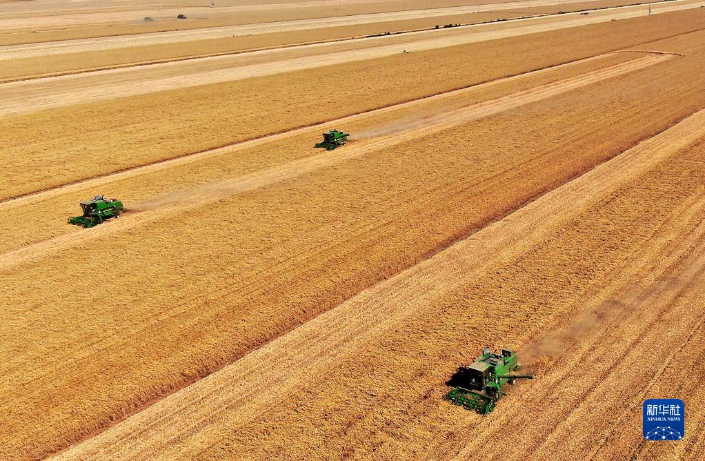 在河南省黄泛区农场九分场的麦田里,农机手操作收割机收获小麦(无人机照片,2021年6月6日摄)。新华社记者 李安 摄