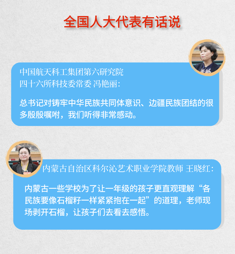 “休戚与共、荣辱与共、生死与共、命运与共”——习近平总书记深刻阐释中华民族共同体理念,让现场代表们印象深刻,倍受激励。与会代表表示,总书记的殷殷嘱托要“牢记在心,落实于行”。