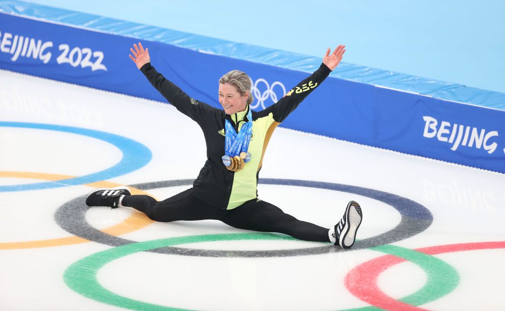 图为八届奥运老将德国选手克劳迪娅·佩希施泰因在北京2022年冬奥会速度滑冰全部比赛结束后留影(2022年2月19日摄)。新华社记者 丁旭 摄