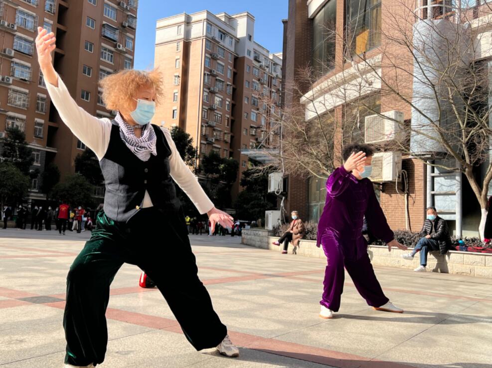 武汉东湖新城社区的居民在小区广场晨练。 湖北日报全媒记者 李溪 摄