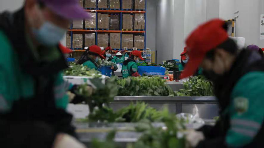 14日,叮咚买菜位于松江区永丰街道的辰塔路蔬果仓里,数百条加工产线上,工人们正在热火朝天地将从全国各地运来的蔬菜、水果进行分拣打包。仓库外,几十辆冷链货车川流不息,将一车车蔬菜水果运往前置仓。据了解,这里每天要接收200余辆运货车次的收发,吞吐蔬果100万件。