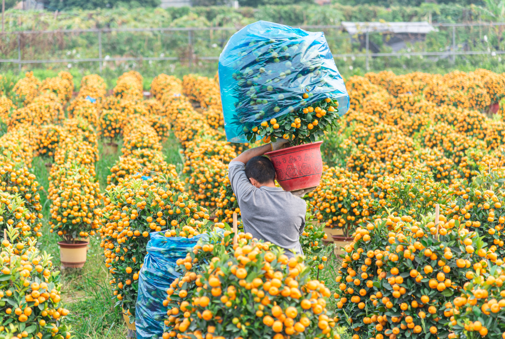 △2022年1月21日,广州南沙区鱼窝头细沥村的农田上种植了大量年橘盆栽,枝头上挂满了果实,正在现场出售中。