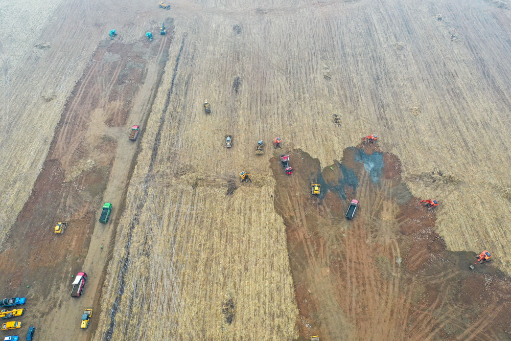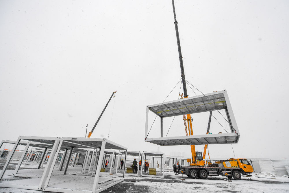 恶劣的天气,阻挡不了“中国速度”。施工现场,各种大型机械马力全开,正火速把一个个公共汽车大小的白色方舱有序组合起来。