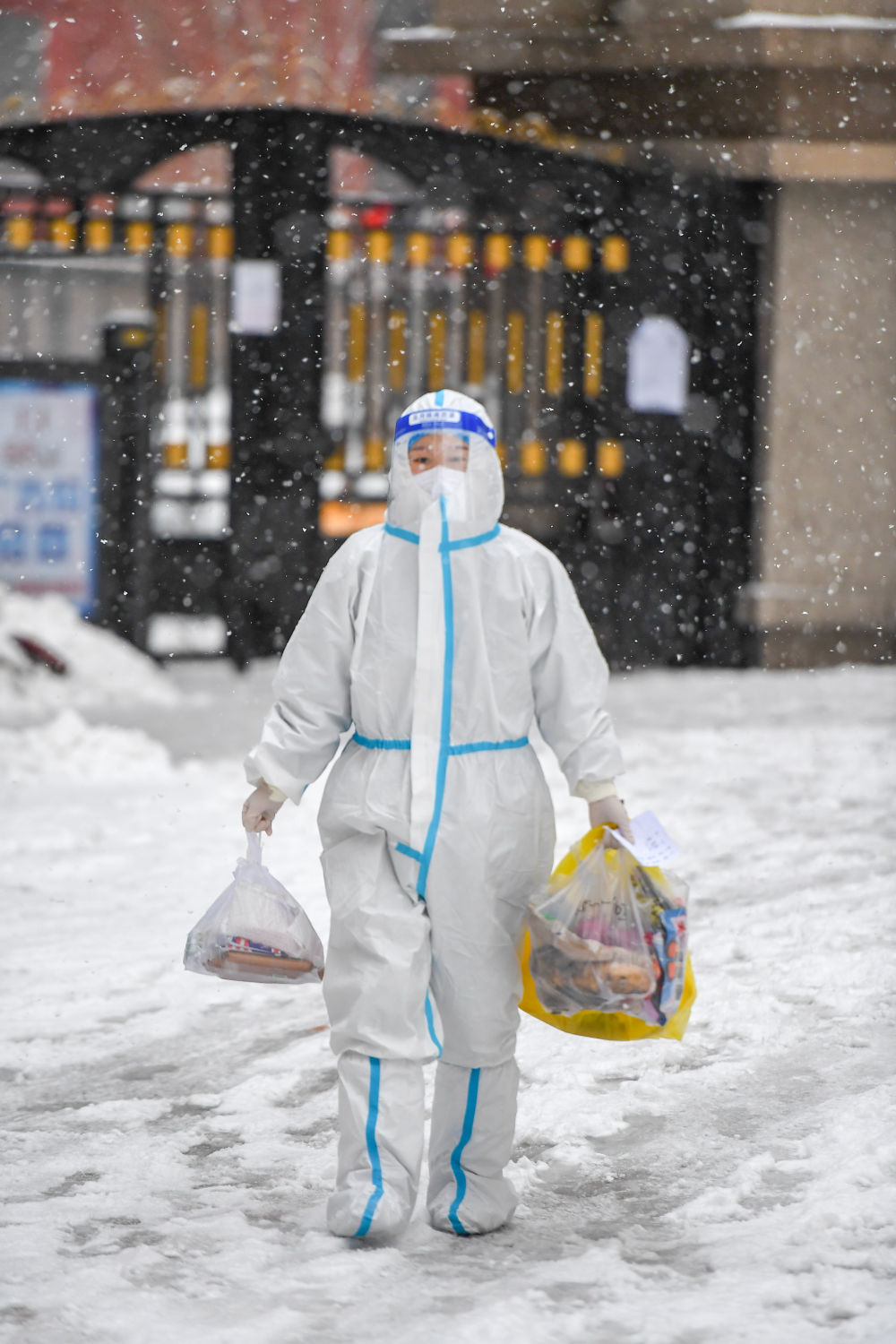 3月15日,吉林省吉林市昌邑区兴华街道中兴社区网格员宋冉为隔离居民运送生活物资。新华社记者 张楠 摄