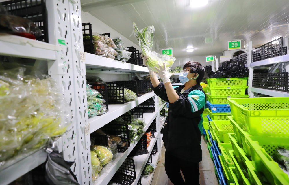 3月15日深夜,在位于上海闵行区老沪闵路的一家网络购物平台仓配站点,工作人员在冷藏库内将新到货的蔬菜分类摆放到货架上。新华社记者 方喆 摄