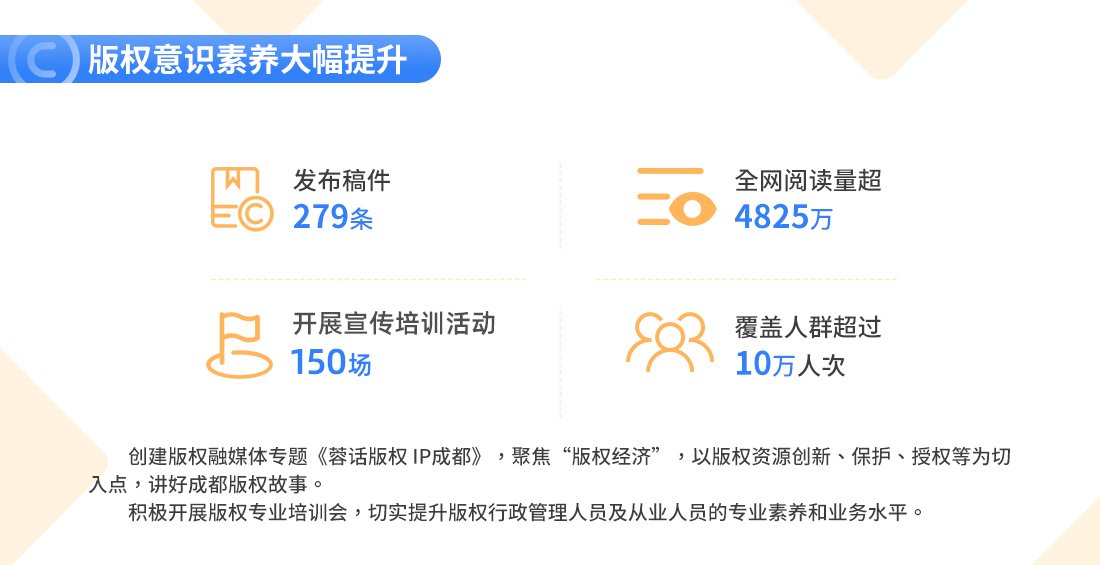 红星新闻网4月25日讯 创新是引领发展的第一动力,保护版权就是保护创新。成都是全国首个版权示范城市,连续三年蝉联全国“查处重大侵权盗版案件有功单位一等奖”,荣膺世界知识产权组织“中国版权金奖·管理奖”,成为全国第三个、中西部首个获批设立“国家版权创新发展基地”的城市。