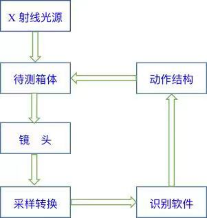 举个例子,生产线的传送带上快速通过的产品,希望通过机器视觉检测产品有没有质量问题,不合格产品自动剔除,从而避免人工检测的不便和低效,提高生产效率。当传送带上的产品经过上方摄像头时,经过X射线的透视成像,机器视觉对产品内部的装配情况进行识别,从而指导机器手臂按要求进行抓取或剔除。下面给出机器视觉系统的示意图。
