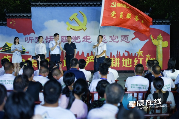 长沙市自然资源和规划局机关第一党支部、长沙市土地整理中心党支部、浏阳市土地整理中心党支部、永安镇机关第四党支部、丰裕村党总支将开展结对共建活动,成立“耕作层土壤再利用工程党员服务队”,王雄文给服务队授旗。