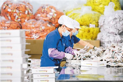 福建省宁德市古田县积极落实阶段性缓缴社保工作,并出台减税降费、金融扶持等各项纾困政策,帮助当地企业渡过难关,实现健康发展。图为7月23日,工人在古田县晟农无公害银耳基地打包银耳产品。