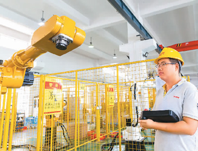 近年来,江苏省海安市坚持科技创新,以智能制造为主攻方向,初步形成机器人研发设计、生产制造、自动化及关键零部件的全产业链发展格局。图为8月16日,位于海安经济技术开发区的江苏图灵智能机器人有限公司车间内,工人在调试工业机器人。