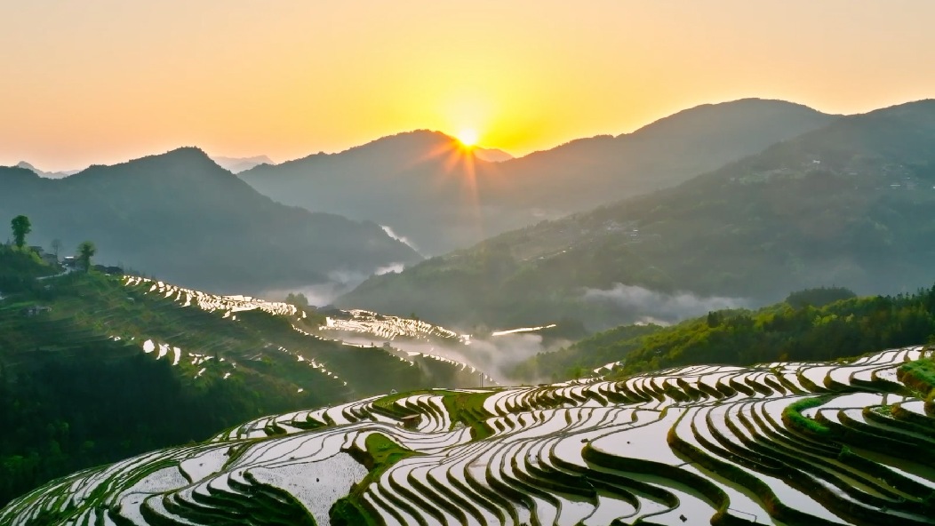 大江南北,清水汩汩作响,缓缓流入充满希望的田野。