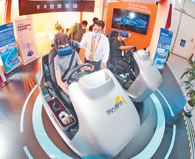 参观者在体验东方时尚驾校的VR智能驾驶培训系统。