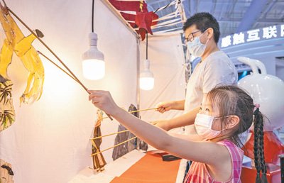 小朋友在体验皮影戏表演。