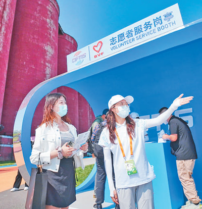 来自北京建筑大学的志愿者在为参观者提供信息指引服务。