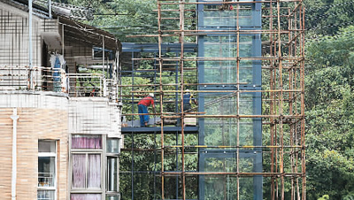 近日,记者来到北京市西城区陶然亭街道里仁东街小区,看见几名施工人员正忙着为5号楼外新安装的电梯搭建钢架。