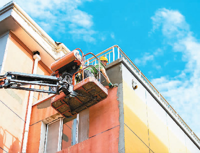 8月19日,工人在内蒙古自治区呼和浩特市玉泉区石东路街道一老旧小区改造升级现场进行外墙真石漆施工作业。