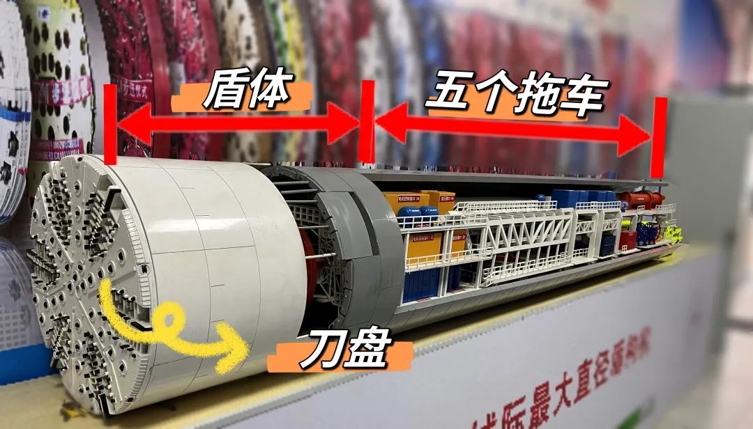 盾构机由刀盘、盾体、配套拖车组成。刀盘为盾构机最前端的“打洞利器”,上面镶嵌着数量众多、形状各异的刀具。盾体为主机部分,起到支撑开挖隧道、保护盾构内部元件设备的作用。“深江2号”共有5节,行走机构在最前面,后面一节节加挂。