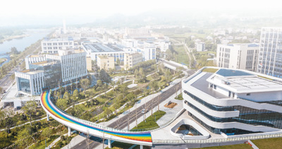 一座半拱形彩虹天桥跨越街道,将生态公园与文化走廊联在一起,早晨有老人们在这晨练,傍晚附近居民愿意到这遛弯,周末这里又成了亲子乐园……这道和谐的风景线,就位于浙江台州仙居经济开发区的医械小镇。