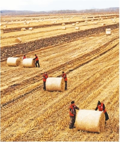 十一月十三日,党员志愿者在内蒙古自治区呼伦贝尔农垦集团那吉屯农牧场田间收储秸秆包。