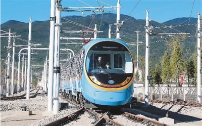 丽江观光火车一期工程是云南省丽江市第一条城市轨道交通线路,连接世界文化遗产丽江古城与玉龙雪山5A级景区,全长约20.8公里,设计时速70公里。11月28日,该工程正式进入通车试运行阶段。图为观光火车驶出丽江观光火车一期工程车辆基地。