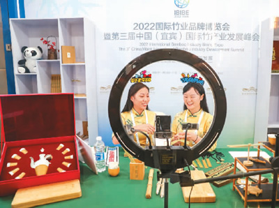 11月10日,在四川省宜宾市国际会议中心,宜宾国际竹产品交易中心的工作人员正通过网络平台向网友们推介用竹子制作的生活用品和工艺品。