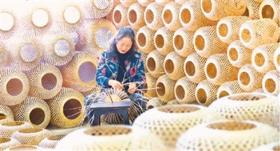 10月11日,在重庆市梁平区屏锦镇新桥社区,重庆瑞海竹艺有限公司的工人在编织竹制仿古灯笼。