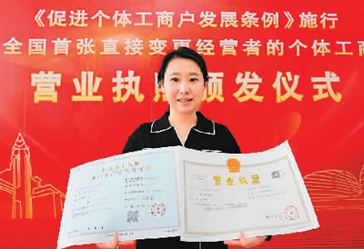 11月1日下午,在北京市东城区政务服务中心,悦宾饭馆经营者郭华拿到了《条例》实施后全国首张直接变更经营者的个体工商户营业执照。“有了这张执照,饭馆几十年的历史又得以延续了。”郭华高兴地对记者说。