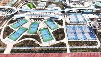 河北省石家庄市利用拆违腾退地、街头路旁空闲地,建成多个高标准球类运动场地。图为该市高铁片区中央绿色体育公园。