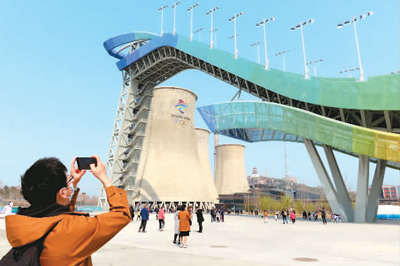市民在北京市首钢滑雪大跳台前拍照打卡。