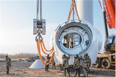 近日,位于内蒙古自治区兴安盟突泉县的华能突泉30万千瓦风电项目结束设备安装。该项目总投资18亿元,年发电量9亿千瓦时,每年减排二氧化碳75万吨,投产后将成为当地绿色低碳发展的新引擎。图为施工人员在项目建设现场吊装风电组件。