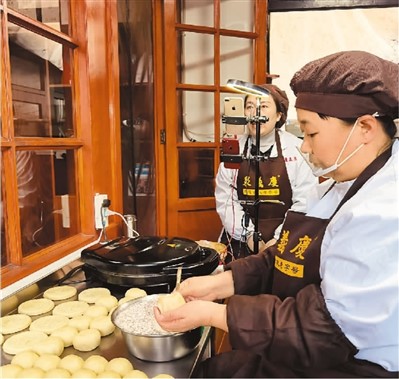 在山西省晋中市平遥古城庆义泉炉食铺内,工人们忙着打月饼、直播卖货。