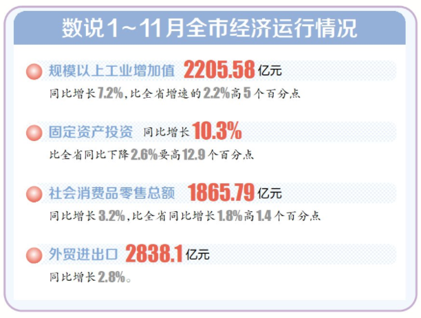1~11月,规模以上工业增加值2205.58亿元,同比增长7.2%,增速比1~10月回落1.0个百分点,比全省增速的2.2%高5个百分点。“2+1”产业中,电子行业增长3.6%;石化能源新材料行业增长11.1%,其中石化产业增长17.6%、能源产业增长2.2%、新材料制造业下降3.4%;生命健康制造业增长10.1%。先进制造业增加值增长9.5%,占全市规模以上工业增加值比重66.0%;高技术制造业增加值增长6.3%,占全市规模以上工业增加值比重39.1%。