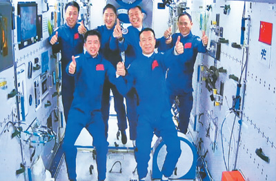 中国天宫空间站是重要的太空基础设施,是促进国际科技合作的重要平台。图为2022年11月30日,神舟十五号航天员乘组与神舟十四号航天员乘组在天宫“胜利会师”后留影。