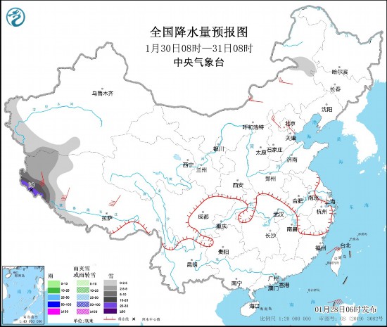 全国降水量预报图(1月30日08时-31日08时)。图片来源:中央气象台网站