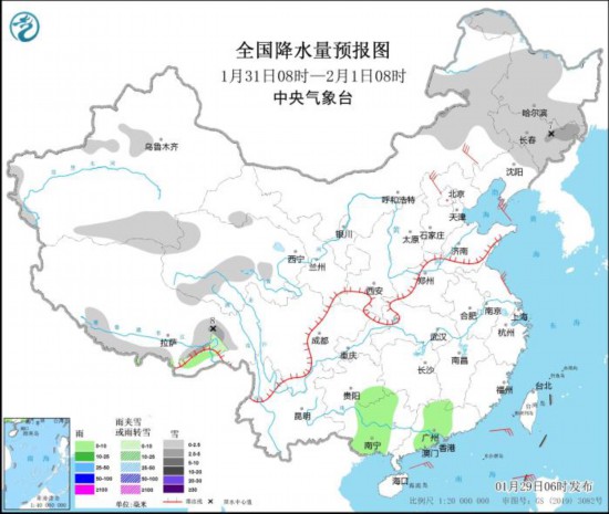 图1 全国降水量预报图(1月29日08时-30日08时)