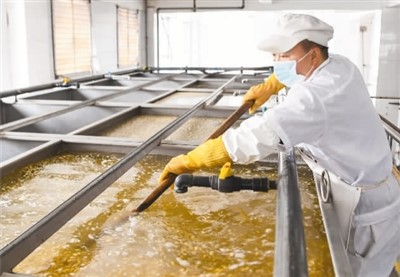 近日,陕西延安甘泉县一家食品公司工作人员在车间浸泡大豆。