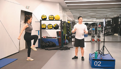 在上海外滩金融中心一处健身房,工作人员通过直播指导网友居家进行健身锻炼。