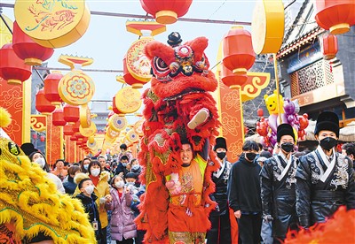 近日,甘肃省兰州市七里河区老街,游人如织。人们赏舞狮、看表演、猜灯谜、品美食,处处洋溢着热腾腾的“烟火气”。兰州老街通过多场景布局、多业态融合、沉浸式消费等途径,每天吸纳近10万游客,成为城市商业、文化和旅游地标。图为游客在七里河区老街观赏舞狮表演。
