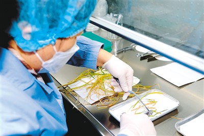 图为2022年12月5日,中科院空间应用中心生物实验室内,研究人员正在处理从太空归来的水稻样品。