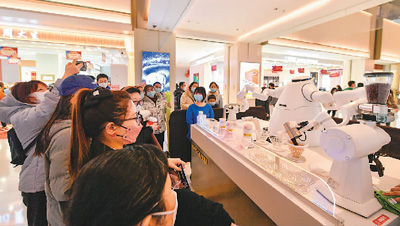 消费者在天津市河东区金茂汇商场内排队购买机器人制作的咖啡。