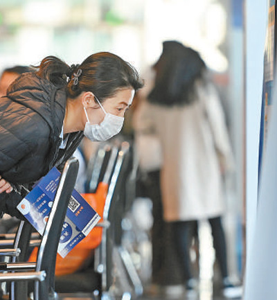2月19日,在天津经开区春季促就业暖心行动公益招聘会现场,求职者查看招聘信息。