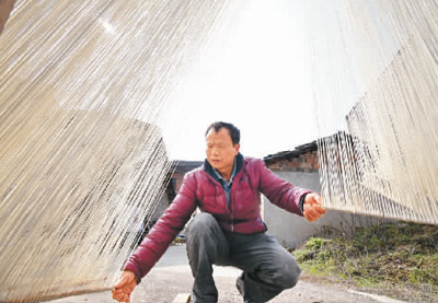 2月16日,江西省抚州市金溪县浒湾镇老街区,油面师傅在晾晒老字号食品浒湾油面。