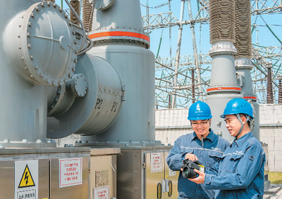 近日,500千伏/90千安经济型高压交流限流器示范工程在广东省广州市建成。该限流器由南方电网广东广州供电局研制,具有可抑制电流大、经济性好、维护便利等突出优势,有助于保障当地生产生活的稳定供电、安全用电。图为工作人员在巡检设备。