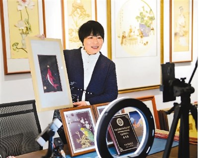河南省驻马店市汝南县大力支持非遗项目麦草画产业化发展,鼓励非遗传承人将非遗作品产业化、市场化。图为在汝南县麦草画传习所内,非遗传承人袁月英直播推介新产品。