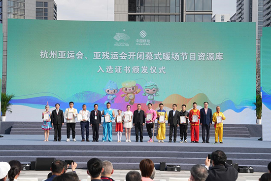活动现场,与会领导为进入杭州亚运会、亚残运会开闭幕式暖场节目资源库的优秀节目颁发证书,全省11地市代表上台接受证书。