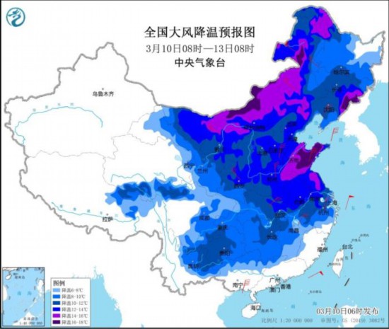 受寒潮影响,预计,3月10日08时至3月13日08时,中东部大部地区气温下降6~10℃,内蒙古、华北、黄淮、江淮东部等地气温下降12℃,局部超过16℃,上述地区先后有4~6级风,阵风7~9级,部分地区并伴有沙尘天气。我国近海大部海域有6~8级风,阵风9~11级。过程最低气温出现在13日早上,最低气温0℃线将位于陕西南部、河南西部、河北南部到天津一线,山东东部和江苏东北部最低气温也将达到0℃左右。