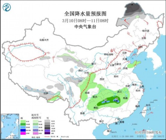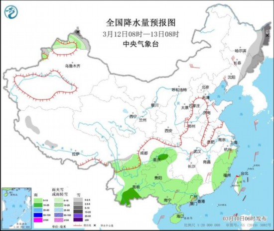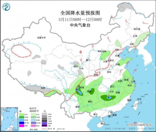 图6 全国降水量预报图(3月10日08时-11日08时)