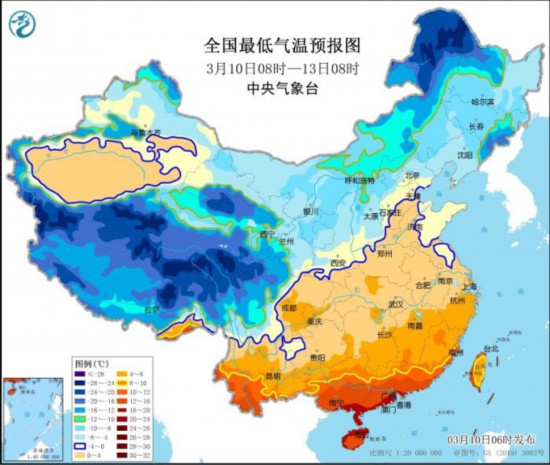 图3 全国最低气温预报图(3月10日08时-13日08时)