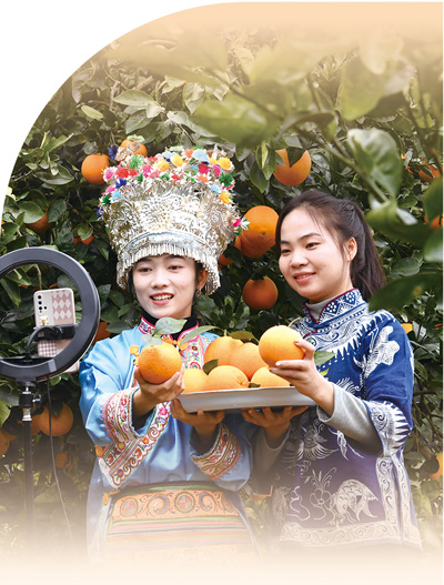 农产品销售主播在贵州省榕江县平江镇一处脐橙种植基地直播推销脐橙。