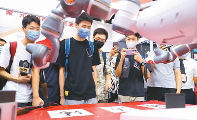 2022世界人工智能大会上,参观者在观看智能机器人演示软笔书法。